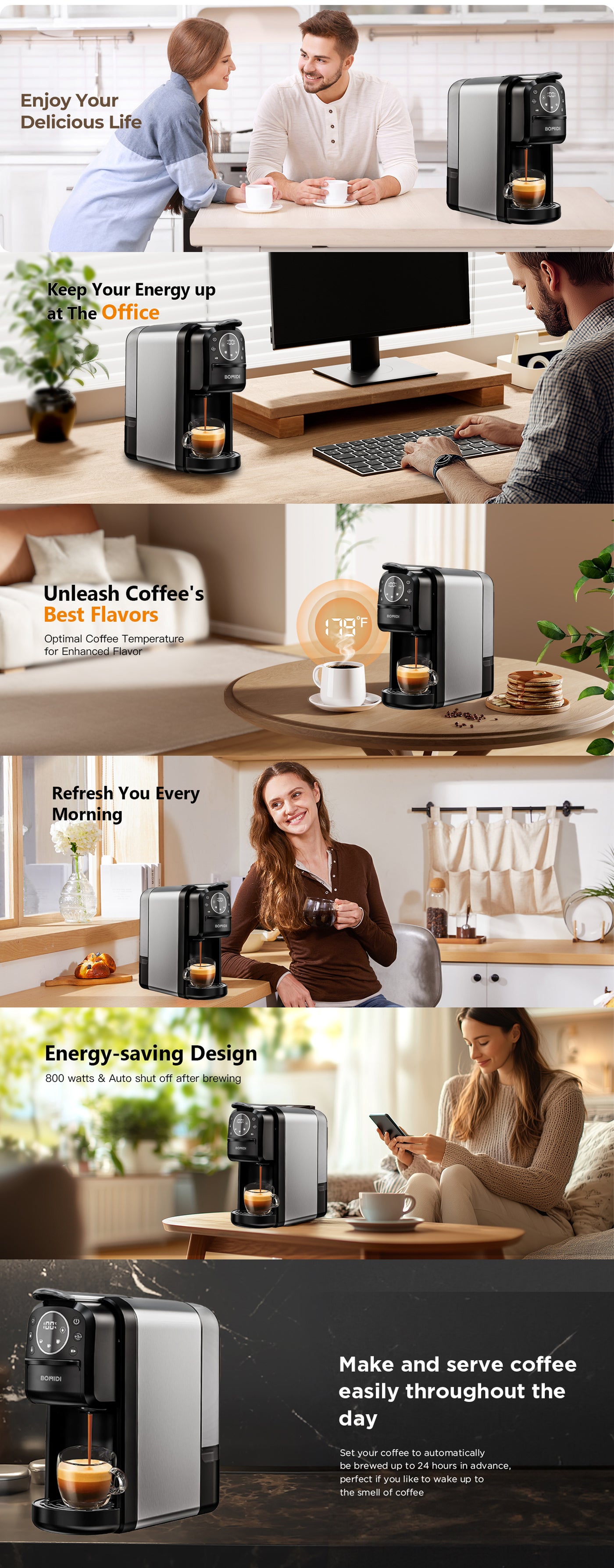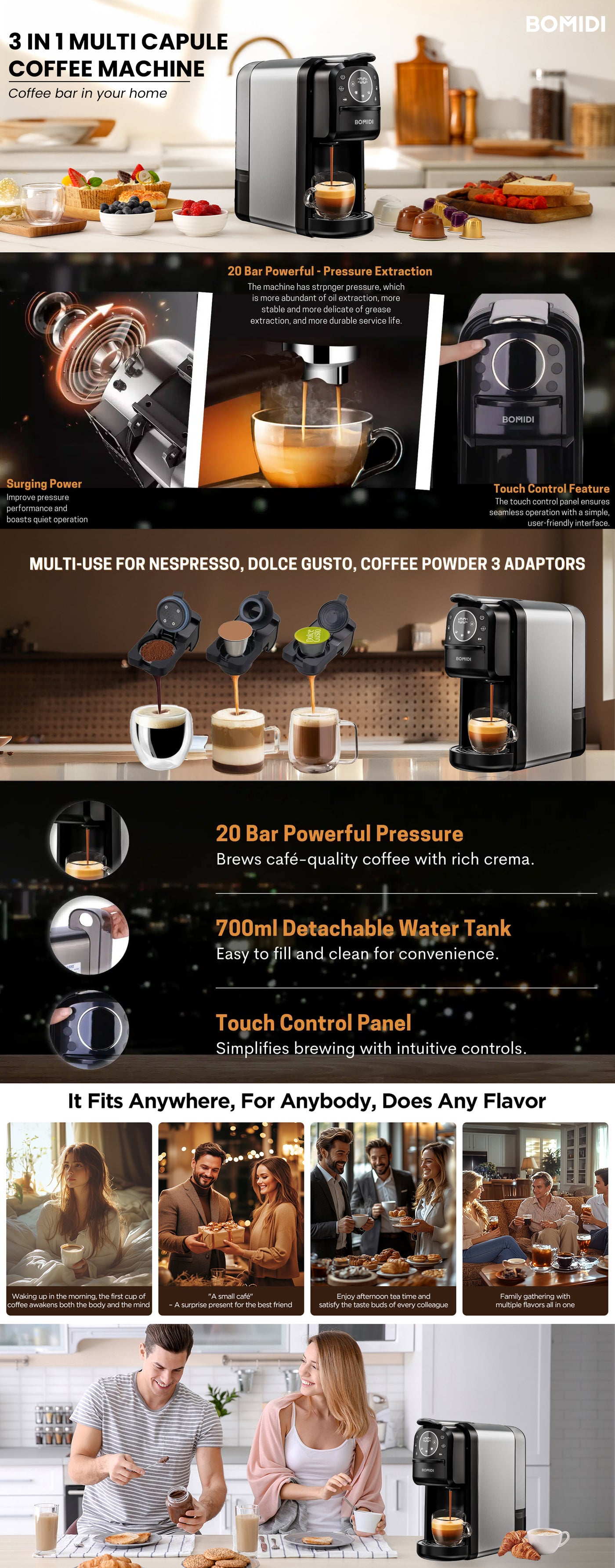 Description for Bomidi CM01 3-in-1 Capsule Coffee Machine, 20 Bar Pressure, Touch Control Panel, Self-Cleaning Function, LED Indicators, 700ML Removable Water Tank,...