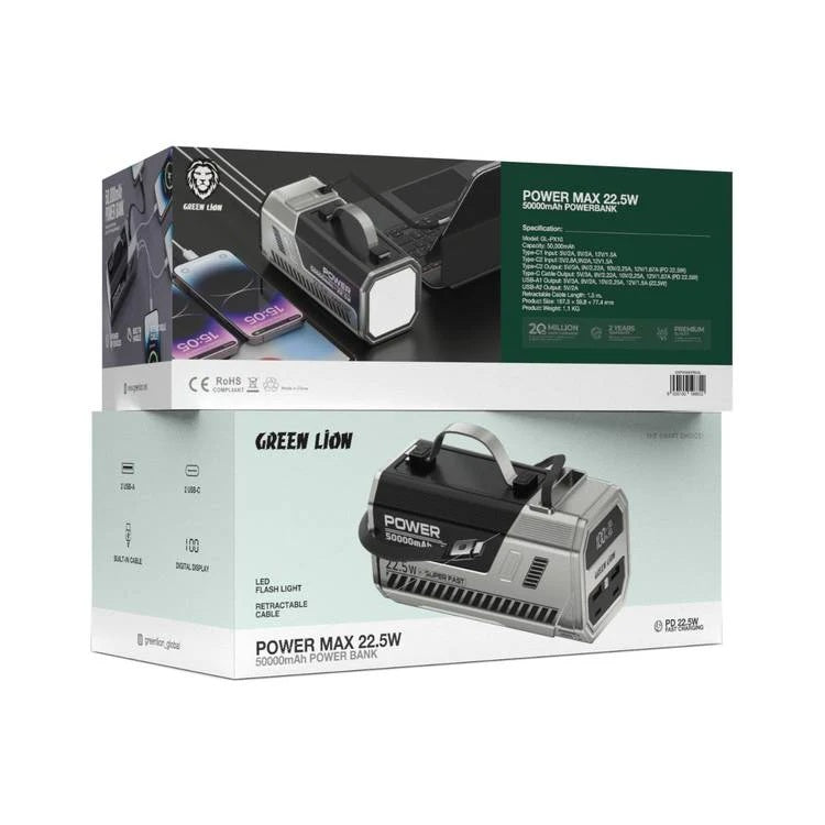 Green Lion Power Max Power Bank With High Lumens LED Flash Light, 50K mAh, Fast Charging, Retractable Cable, Digital Display, Multi Device Charging - Silver